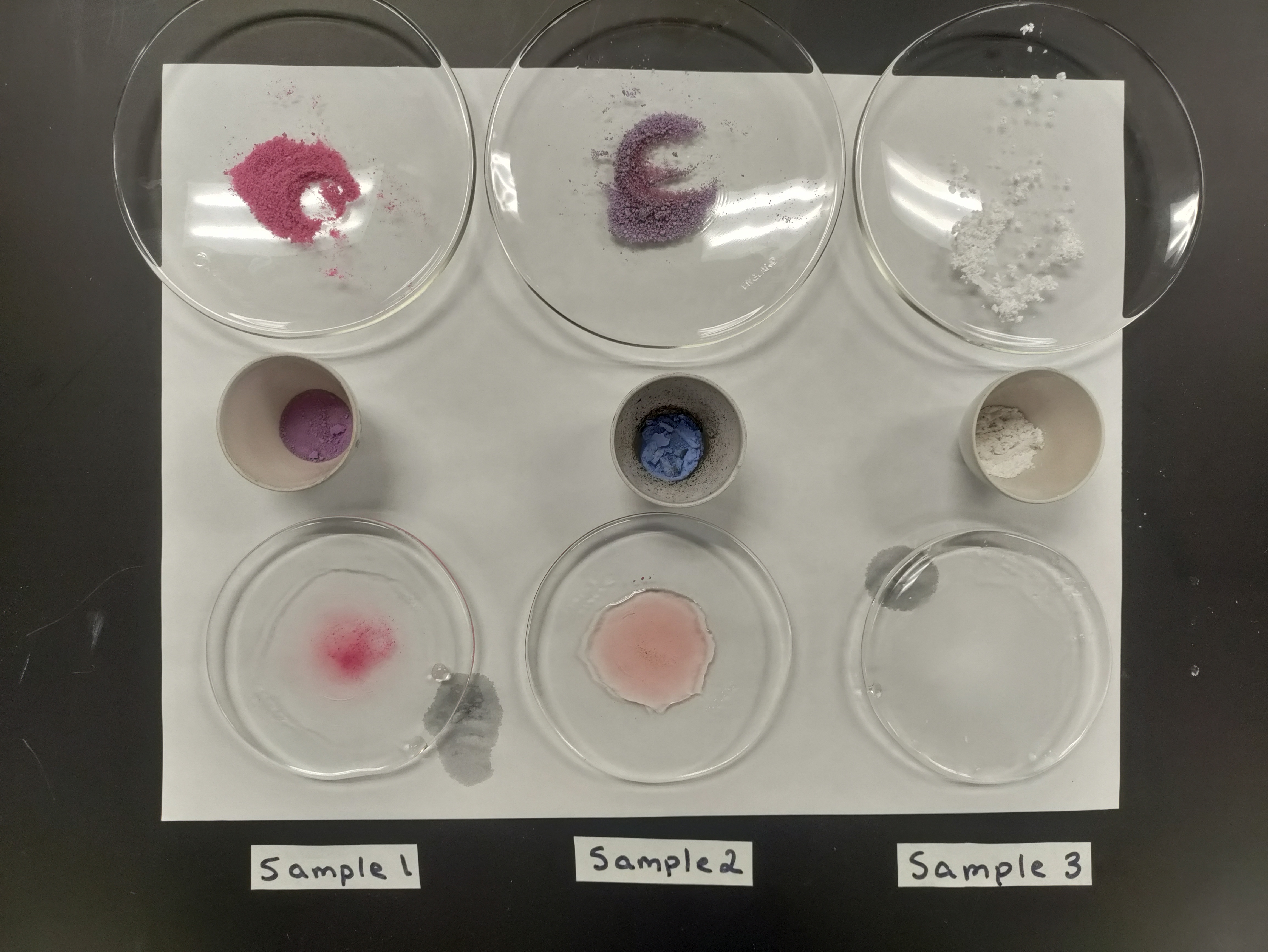 1. Lastly, return to the three samples you've collected in test tubes. Add a small portion of water to each tube and note the the color of the solutions they form.